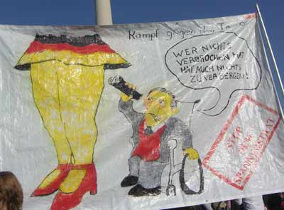 Hier ein paar Bilder: Am Alex sammelte man sich und wanderte dann zum Brandenburger Tor. U.a. sprachen ein Vertreter der Ärzteschaft gegen die "Gesundheitskarte" sowie die Freundin des Soziologen, der letztes Jahr unverschuldet in die Mühlen von §129a geriet… http://annalist.noblogs.org/post/2008/10/10/freiheit-statt-angst http://www.stoppt-die-e-card.de Zu den Veranstaltern gehörten neben dem AK-Vorratsdatenspeicherung auch die Grünen, die Linkspartei und die FDP(!)... http://www.vorratsdatenspeicherung.de/content/view/264/1/lang,de/ Und insgesamt war es auch sehr friedlich! Nervig waren nur die Hunde, die von Polizisten geführt hie und da ziemlich laut herumgekläfft haben. War das nötig?