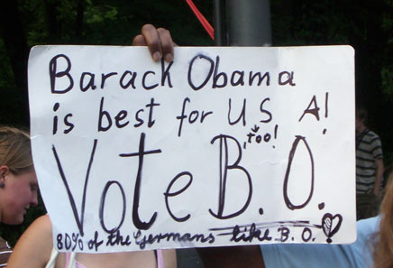 Allerdings, ich glaube nicht, dass hier, in dieser halben Stunde Rede eines Kandidaten irgendjemand etwas Weltbewegendes erwartet hat (ob er sie selbst geschrieben hat?). Denn das ganze war insgesamt eine recht seltsame Veranstaltung! Eher Pflicht als Kür für die Kameras auf der festlich beleuchteten Tribüne gegenüber - und da saßen neben den üblichen Verdächtigen von ZDF und ARD sicher auch US-Journalisten, für die die Rede bestimmt mehr gedacht war als fürs Publikum. So würde ich die ganze Veranstaltung eher als Wahlkampf für die Heimat betrachten, denn irgendwie war es auch so seltsam steril, eine Inszenierung wie für einen Film, alles nach Drehbuch. Und wir waren die Statisten im Publikum. Zum Publikum: Nun, es sind viele Englisch-sprechende und auch viele schwarze Leute darunter, einige Fans mit T-Shirt und Schildern und aber auch ein paar Leute, die Kritische Plakate mit sich führen. Der Altersdurchschnitt ist eher jung als alt, die Pop-Konzert-Assoziation bleibt weiterhin aktuell.